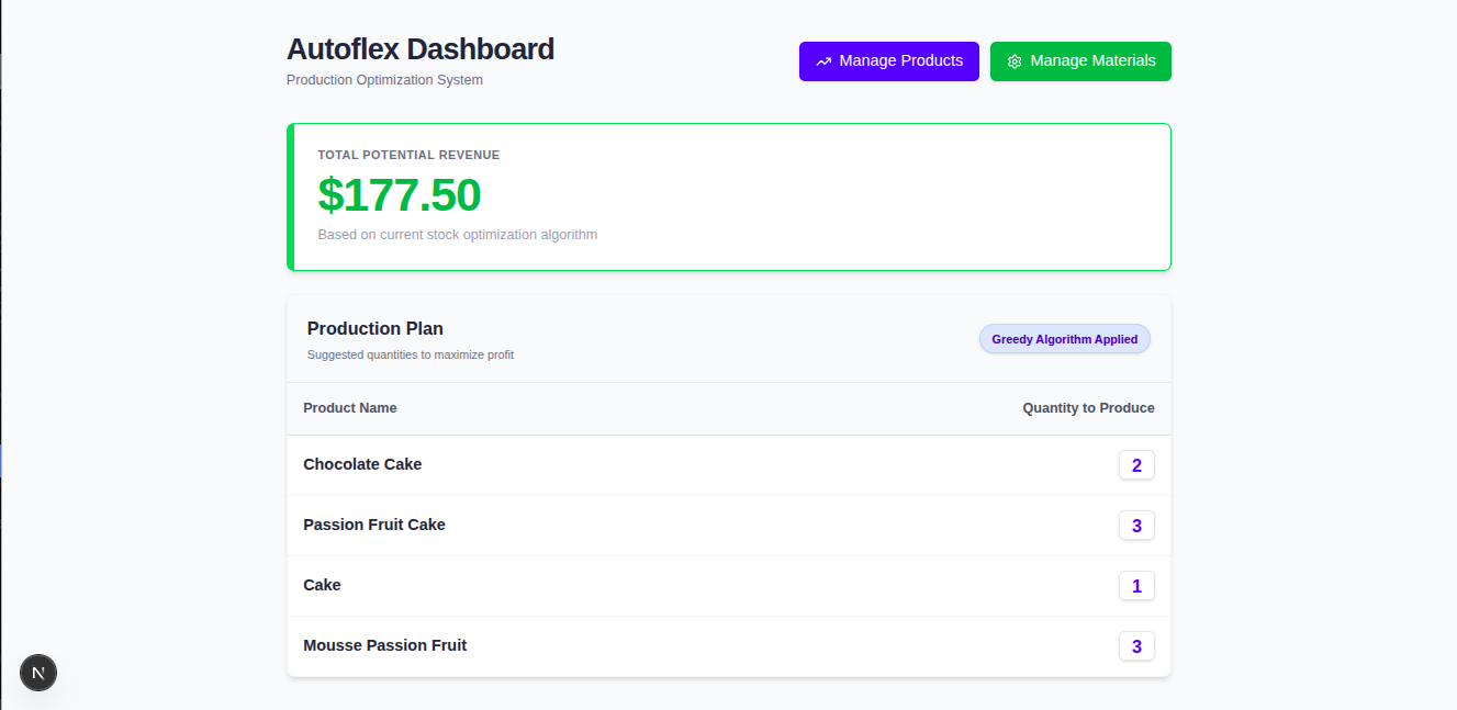 Sistema full-stack desenvolvido para otimização de linha de produção industrial. Implementação de Algoritmo Guloso (Greedy Algorithm) para maximização de lucro baseado em gargalos de estoque. Cobertura de testes unitários para regras de negócio e testes E2E para fluxos de interface.
